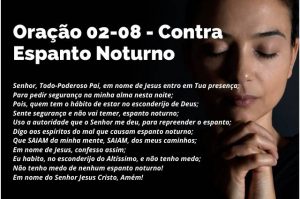 Que começa assim “Aquele que habita no esconderijo do Altíssimo, a sombra do Onipotente descansará”. Eu, sofri muito com medo de assombrações no passado, e sempre que eu fazia sob orientação do pastor a leitura em vós alta da oração do salmo 91, eu dormia em paz”. Encontre aqui um modelo de oração que afasta o mal.